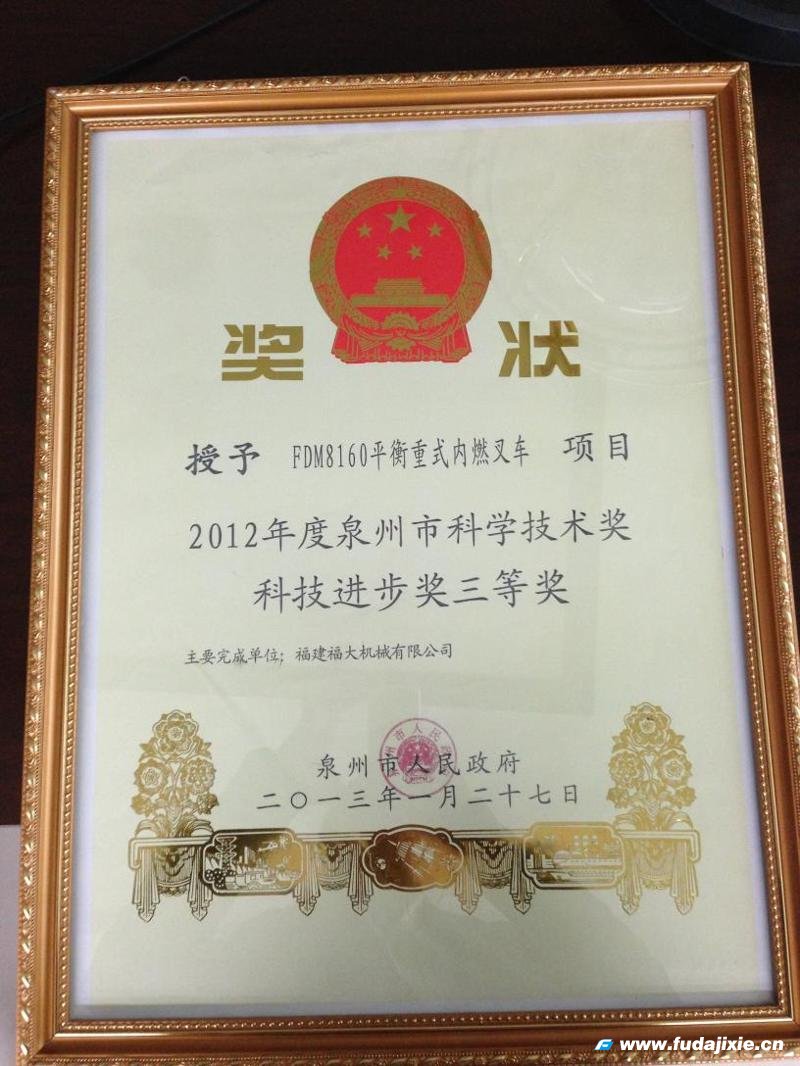 获奖背后,是政府部门对我司科技创新引导和鼓励的体现,更是我司科技综合水平不断进步和个人研发实力的展示。自创立以来,公司始终坚持“战略,发展,创新,蜕变”的企业经营理念,大力推进企业自主创新,不断提升企业知识产权创造和运用水平,公司科技创新工作取得丰硕成果,佳音频传,不仅产品以减少污染、节能高效的性能获得客户的一致好评,更为欣喜的是继获得“2011年度福建省优秀新产品奖二等奖--FDM8300平衡重式内燃叉车”荣誉之后,再获泉州市人民政府授予的“2012年度泉州市科技进步三等奖”。科技奖捷报传来,对我司促进科技创新和发明创造,激发企业和个人科研动力,促进产业和社会发展,乃至进一步在全社会营造尊重科学、致力创新的氛围,都是最有力的褒奖,也是最给力的推动。